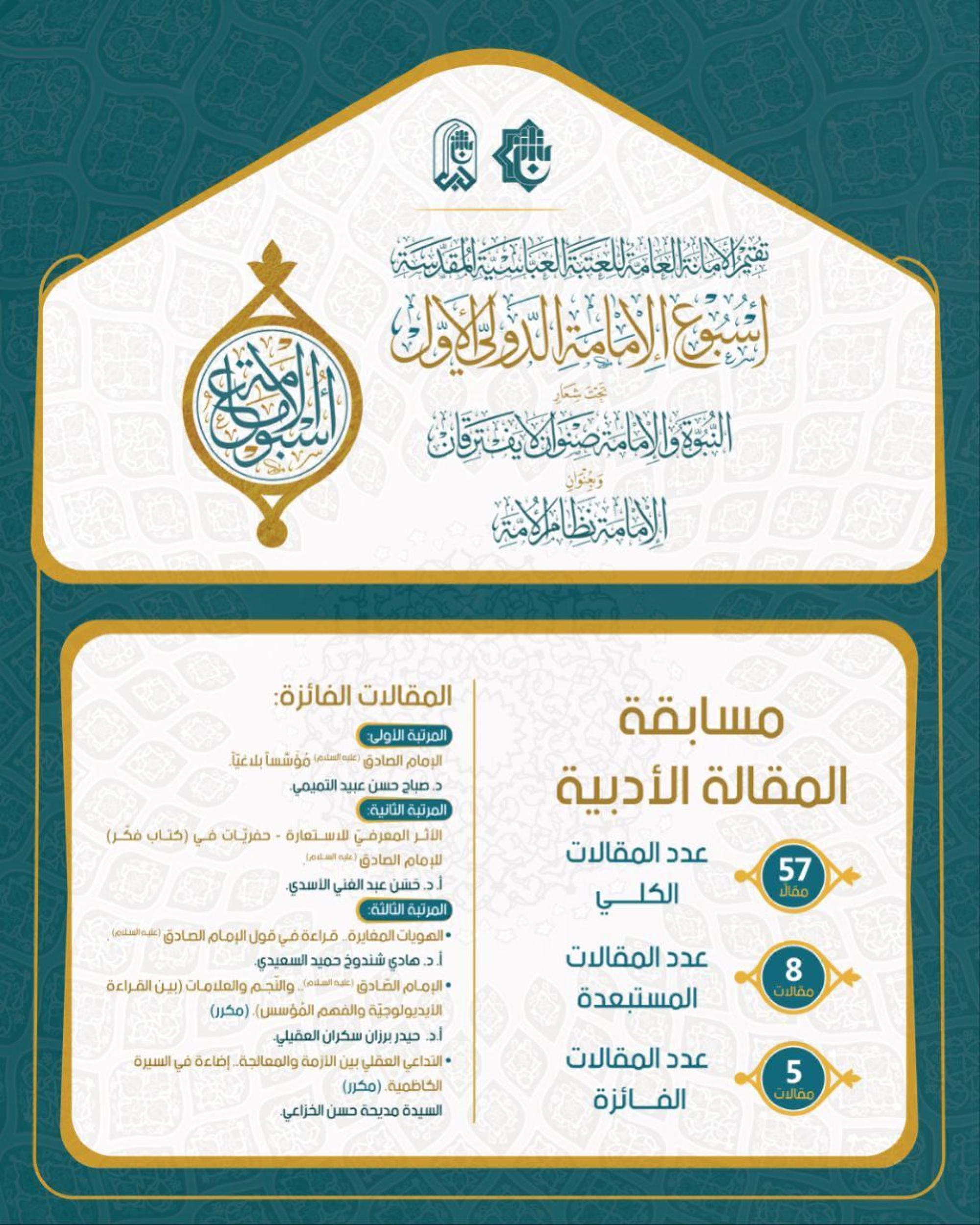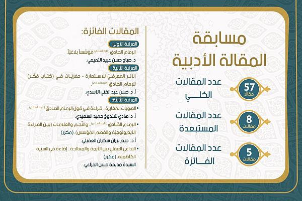 أنهى قسم شؤون المعارف الإسلامية والإنسانية في العتبة العباسية، أعمال تحكيم المقالات المشتركة في مسابقة المقالة الأدبية، ضمن فعّاليات أسبوع الإمامة الدولي الأول. وتقيم العتبةُ العباسية فعّاليات أسبوع الإمامة في السادس من تموز الجاري، تحت شعار: (النبوّة والإمامة صنوان لا يفترقان) وبعنوان (الإمامة نظام الأُمّة). وخصّصت المسابقة لأفضل مقالٍ يتناول حياة الإمامين جعفر الصادق أو موسى الكاظم(عليهما السلام) وسيرتهما العلمية، وقد بلغ عدد المقالات المشاركة أكثر من 55 مقالاً متنوّعاً، تمّ استبعاد 8 منها لعدم استيفائها الشروط المطلوبة. وأحرز المركز الأوّل الدكتور صباح حسن التميمي عن مقالته: (الإمام الصادق -عليه السلام- مؤسّساً بلاغياً)، أمّا المركز الثاني فكان من نصيب الدكتور حسن عبد الغني الأسدي الذي قدّم مقالة بعنوان: (الأثر المعرفي للاستعارة - حفريات في -كتاب فكر- الإمام الصادق عليه السلام). فيما حظي بالمركز الثالث ثلاثة من المتسابقين بعد حصولهم على نفس الدرجة، وهم كلٌّ من: (أ.د. هادي شندوخ السعيدي، أ.د. حيدر برزان العقيلي، والسيدة مديحة حسن الخزاعي). وأُخضِعت المقالات المتسابقة لبرنامج الاستلال، ووصلت إلى لجنة التحكيم بدون أسماء؛ ليتمّ تقييمها بحيادية تامّة، والتعامل مع المكتوب بغضّ النظر عن الكاتب. وضمّت لجنة التحكيم المشكّلة من رئاسة قسم المعارف أربعة محكّمين هم (السيد كاظم الناشي، السيد زين العابدين السعيدي، السيد علي العكابي، السيد كرار الفتلاوي)، وقد حرصت على اتّباع ضوابط علمية وأكاديمية في تقييم المقالات كافة؛ من أجل إعطاء كلّ ذي حقٍّ حقّه. وتتضمّن فعّاليات الأسبوع إقامة سبع مسابقات ثقافية وفنية هي، (مسابقة الأفلام القصيرة، مسابقة الفنون البصرية للشباب، المسابقة الشعرية، مسابقة الخطّ، مسابقة المقالة الأدبية، مسابقة البوستات الفنية ومقاطع الفيديو القصيرة، مسابقة القصة القصيرة).