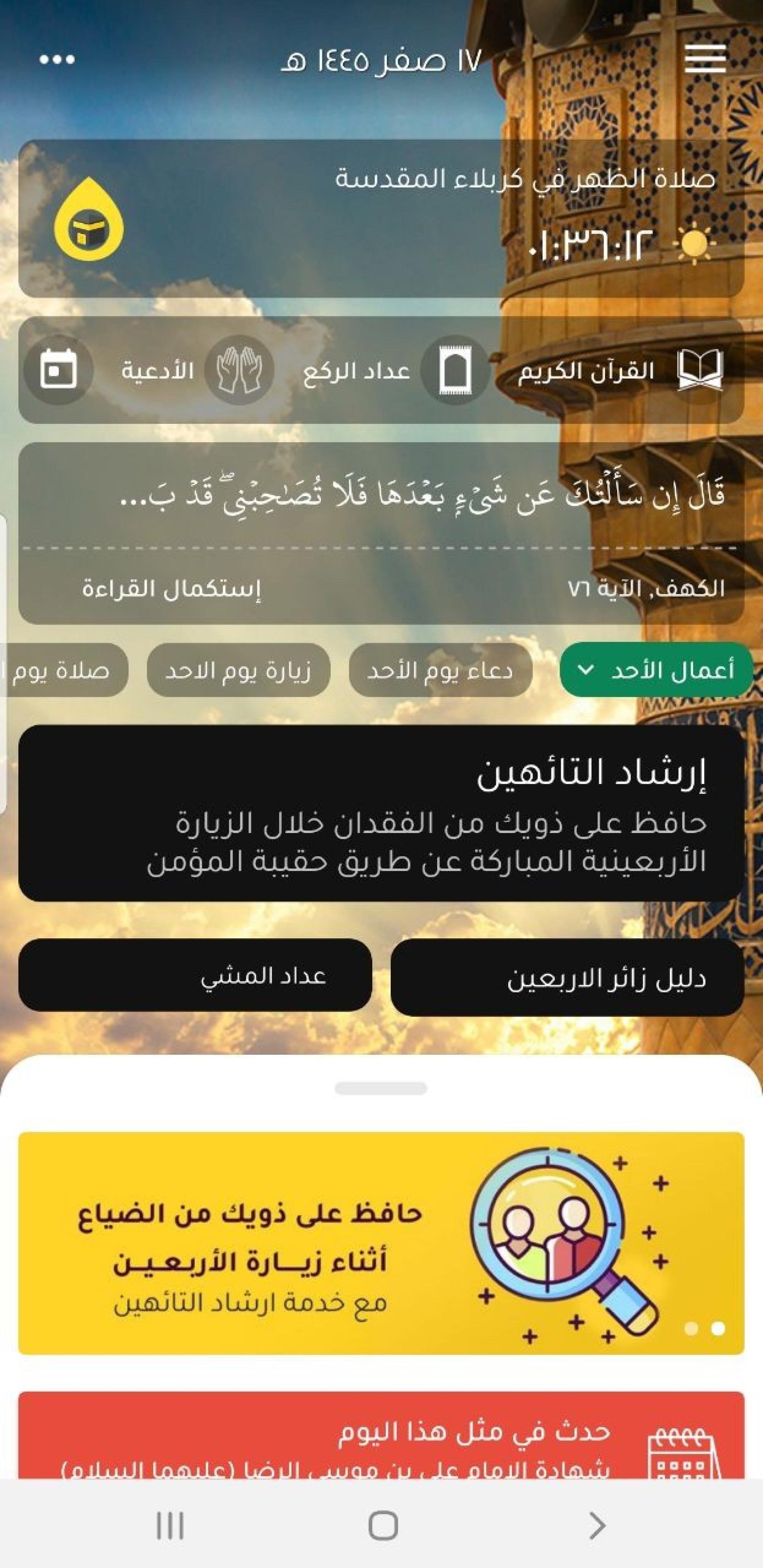 أطلق قسم الشؤون الفكرية والثقافية في العتبة العباسية المقدسة، خدمة دليل الزائر، وهي إحدى الخدمات الإلكترونية المقدمة عبر تطبيق حقيبة المؤمن بذكرى زيارة الأربعين المباركة. وقال مسؤول مركز حقيبة المؤمن التابع للقسم السيد علي الجياشي إن "الخدمة التي أطلقها المركز تعنى بتقديم كل ما يحتاجه الزائر من مواقع مهمة في مدينة كربلاء، حيث المراقد والحسينيات والمواكب والفنادق والحمامات الصحية وبعض النقاط الدالة".وأضاف أن "بوابة الخدمة تضمنت ادخال أكثر من 5000 مكان مع تحديد الموقع الجغرافي الدقيق بواسطة الـ(GPS) حسب التكنولوجيا الحديثة التي يعمل عليها المجتمع في إيجاد المواقع المهمة" لافتاً الى أن "عدد المستفيدين من الخدمة بلغ (642.884) مستخدم". وبحسب الجياشي فأن "المميزات التي يوفرها التطبيق للمستخدم هي خدمة إظهار بعد المسافة بين المستخدم والنقطة المقصودة والوقت المستغرق لقطع هذه المسافة كما يوفر خاصية إرشاد المستخدم الى المكان المقصود عن طريق رسم خط على الخارطة".